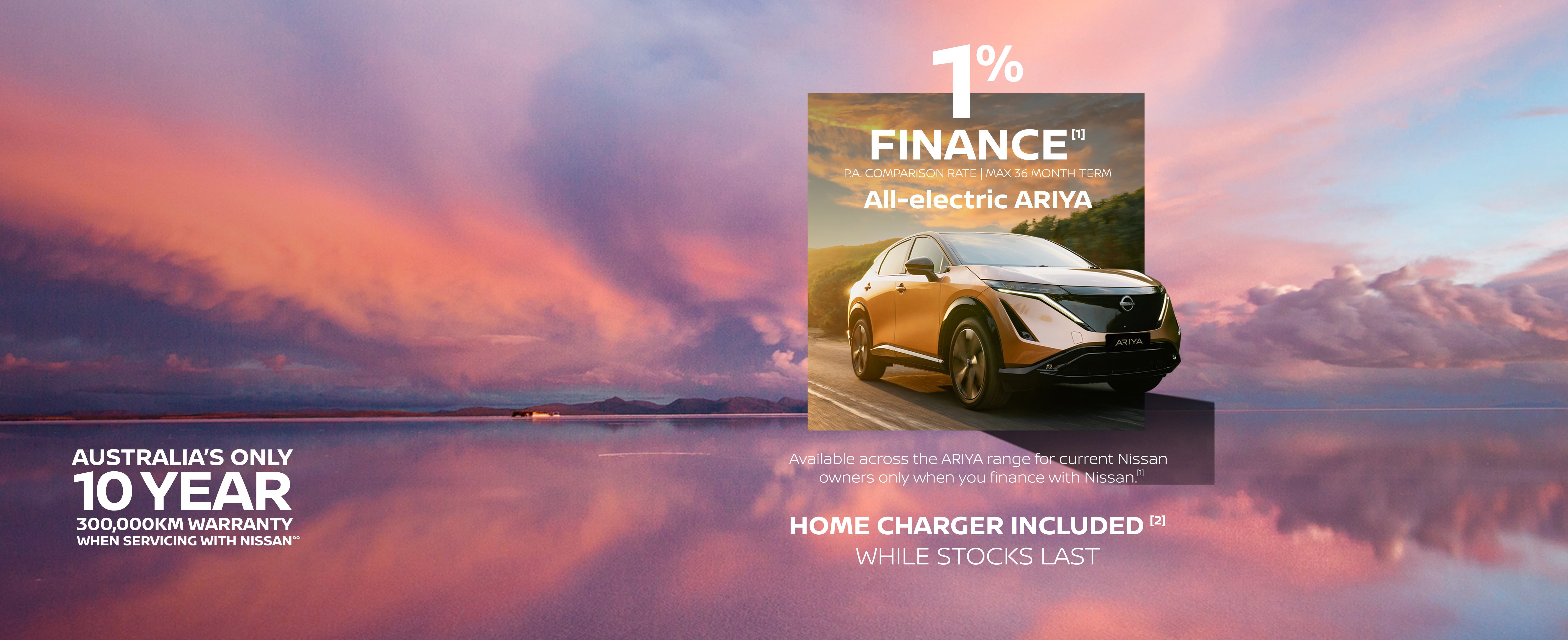 [1] The ARIYA loyalty finance offer is available to current Nissan vehicle owners and any immediate family members residing at the same address as a current Nissan owner. Terms and conditions apply. 1% Comparison rate for approved personal applicants and 1% APR for approved business applicants of Nissan Financial Services (Australian Credit Licence Number 391464). Maximum 36 month term. This comparison rate for the purpose of the National Credit Code is based on a 5 year secured loan of $30,000, although this offer relates to a 36 month term only. WARNING: This comparison rate is true only for the example given and may not include all fees. Different terms, fees or other loan amounts might result in a different comparison rate. Offer available as standard finance on new and demonstrator ARIYA vehicles purchased between 01/04/2026 and 30/04/26, and settled by 31/05/2026, while stocks last. Proof of current vehicle ownership required, and family members must provide proof of residence matching the vehicle owners. Current Nissan vehicle does not need to be traded in to receive the offer. Nissan reserves the right to vary, extend or withdraw this offer. Excludes Used Cars, Government, Rental and National Fleet customers.