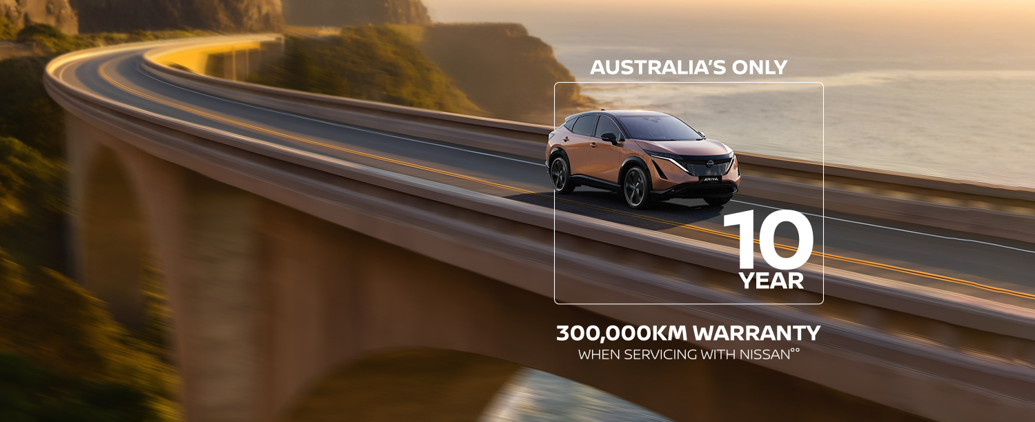 °°Up to 10 years or 300,000km (whichever occurs first), when servicing at authorised Nissan dealers. Where vehicle is not serviced through Nissan or ceases to be serviced at Nissan, additional years will not be added so 10 year/300,000km warranty (whichever occurs first) may not apply. Warranty protection will remain 5 year/unlimited km warranty, plus any additional service activated years previously added. Conditions apply. Lithium-Ion battery pack warranted against battery capacity loss below 9 bars out of 12 (as shown in vehicle capacity gauge), for a period of 8 years or 160,000 kilometres, whichever occurs first. Full terms at Nissan.com.au/warranty.